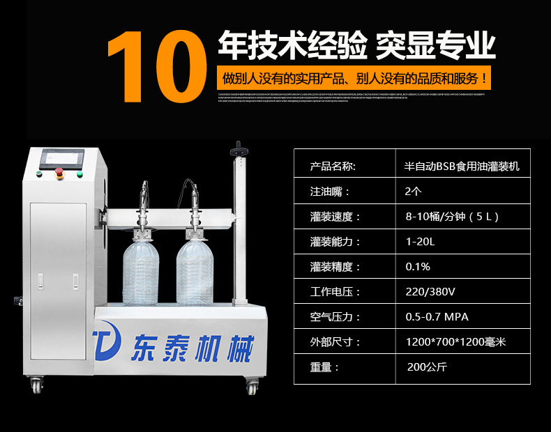 本機適用于花生油、大豆油、菜籽油、色拉油、芝麻油、石油化工潤滑油等各種油類和粘稠液體的定量要求。半自動雙頭電動BSB食用油灌裝機:采用的微電腦技術(shù),自備動力,管路無需加壓,節(jié)約運行成本;自動檢測油浙、自動修正溫度變化引起的密度變化,適合大溫差環(huán)境的油品灌裝工作,使用方便靈活;機電一體化設(shè)計,安裝方便,整機價格低廉。