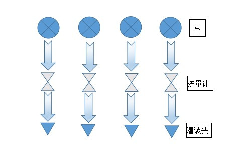 從圖中我們可以看出該種方式去掉了流量計(jì)灌裝機(jī)的核心—流量計(jì),采用計(jì)量泵的灌裝方式,一個(gè)計(jì)量泵配合一個(gè)灌裝頭,那么這種方式是不是更好呢?